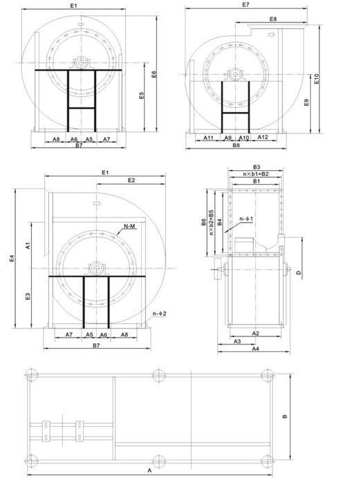 (九)、4-79系列14E-16E離心風機外形尺寸表